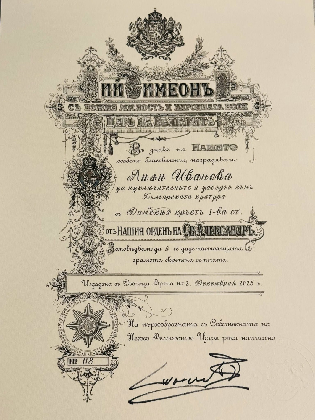 Екипът на Лили Иванова публикува и текста на решението за награждаването. В него се посочва, че с особено благоволение тя се удостоява с „Дамски кръст“, първа степен, на ордена „Свети Александър“ за изключителните ѝ заслуги към българската култура. Документът е скрепен с печата на ордена и подписан собственоръчно от Цар Симеон II.