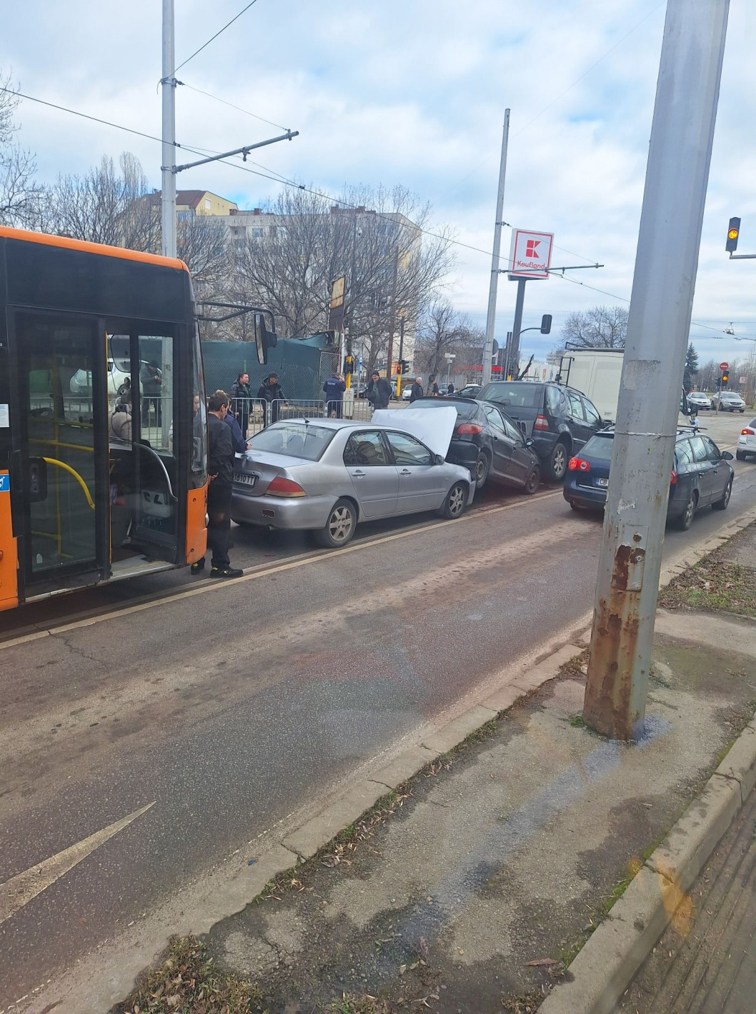Зрелищна верижна катастрофа между 4 коли, бус и автобус на градския транспорт е станала в София, съобщават очевидци на произшествието във Facebook.