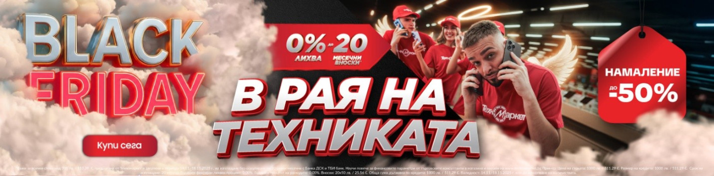 Черният петък е в разгара си - влез в Техномаркет  и разгледай огромно разнообразие от продукти с до -50% отстъпка. Възползвай се от изгодно изплащане с 0% лихва до 20 месеца на продукти над 300лв. Побързай, СЕГА Е МОМЕНТЪТ да спестиш!
