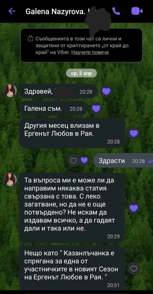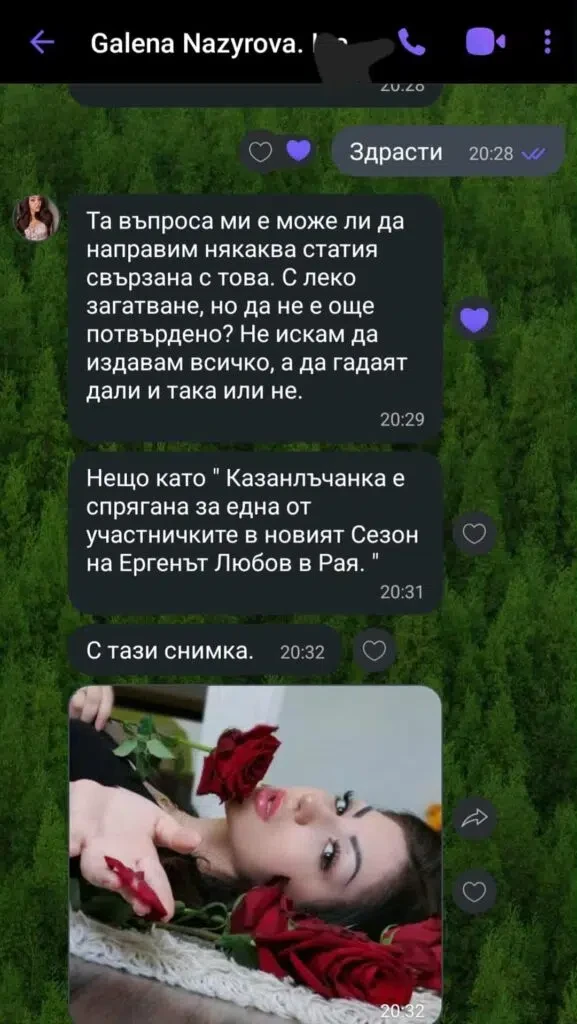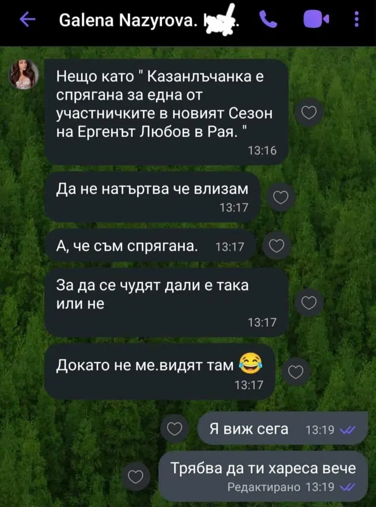 Оказва се даже, че тя е нарушила договора си с предаването „Ергенът: Любов в рая“, за което може да носи финансови последствия. Тя е разказала на журналист, че ще влиза във формата месец преди това да се случи, което е едно от най-сериозните нарушения в правилата на предаването. Показваме ви част от кореспонденцията на Галена Назърова с различни журналисти, които са писали статии за нея.