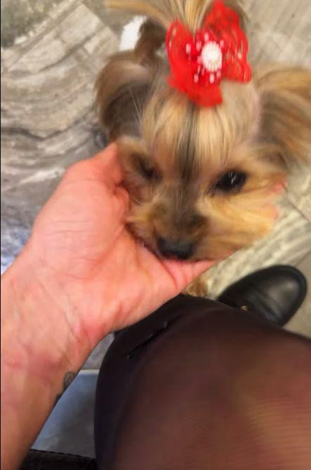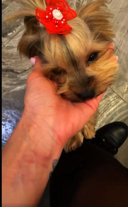 Бившата плеймейтка показа синини по китките на ръцете си. На снимката тя гали кученцето на приятелка, като ясно личат следите от насилие.
