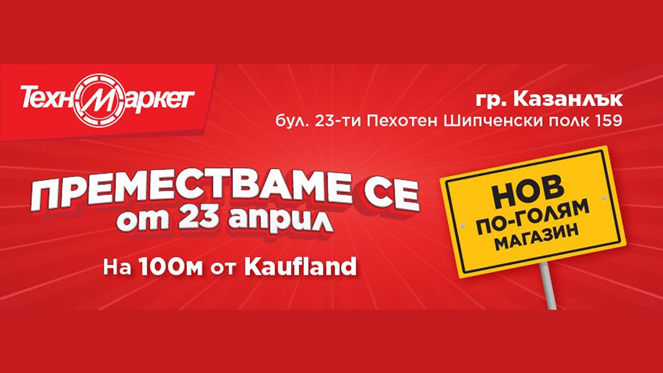 На 23 април 2026 г. Техномаркет ще отвори врати на своя нов магазин в гр. Казанлък, като част от стратегията си за развитие и по-добро обслужване на клиентите в региона.