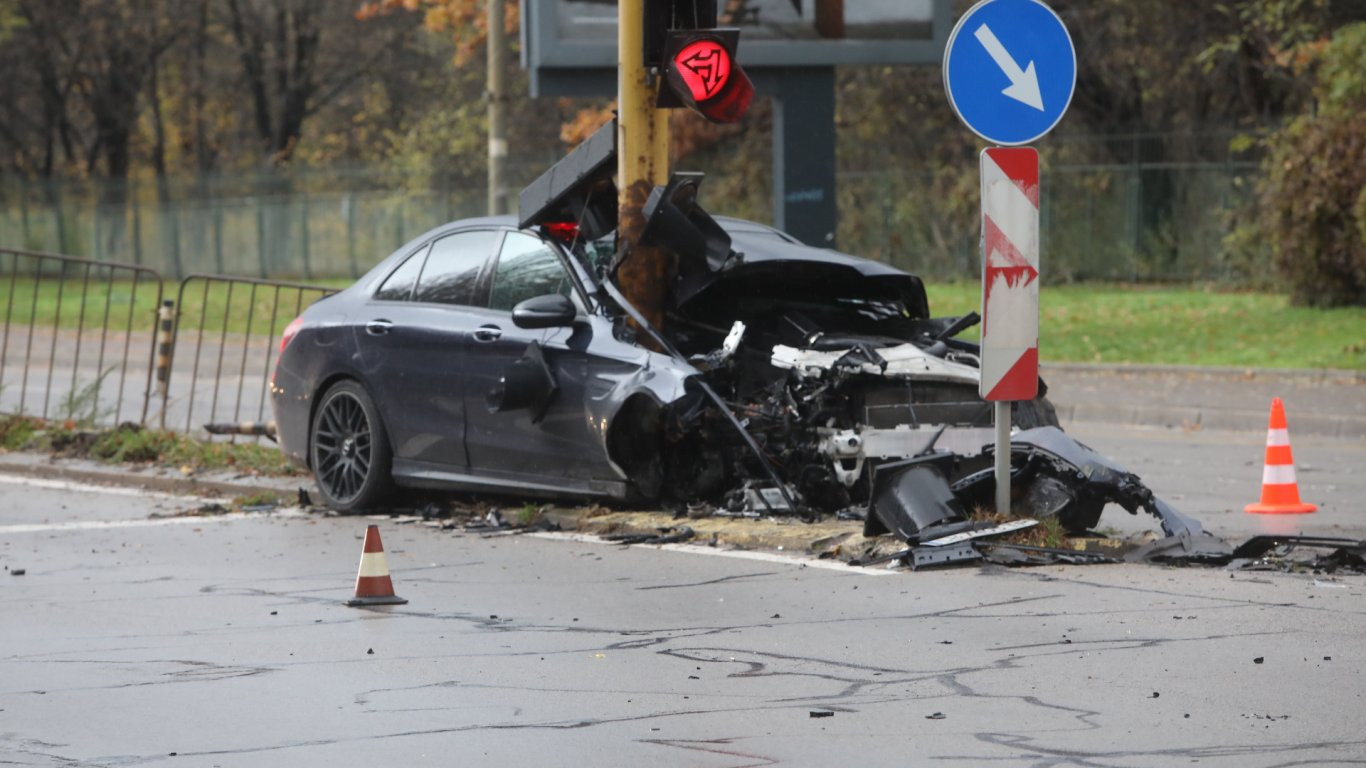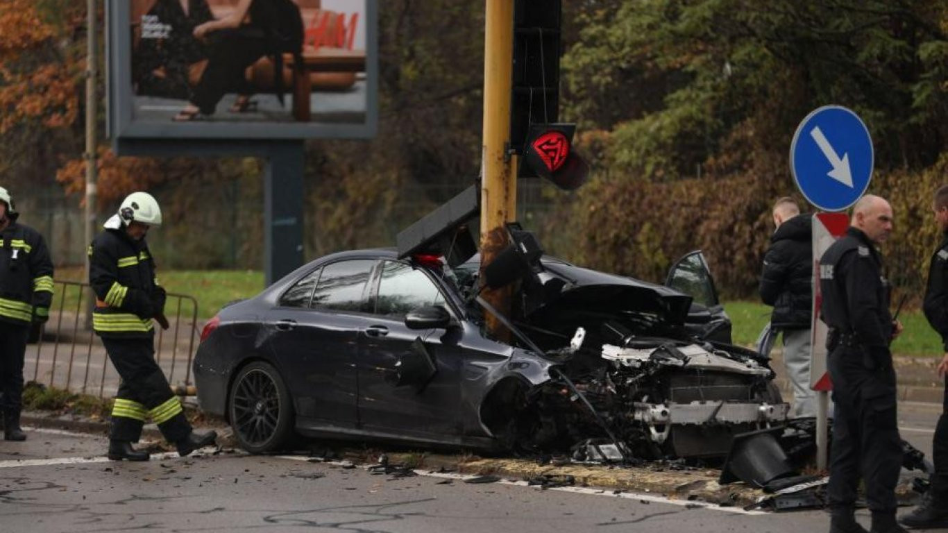 Мощен Мерцедес се е нанизал в стълб на светофар вчера пред бившето кино "Арена" на столичния булевард "Тодор Александров".