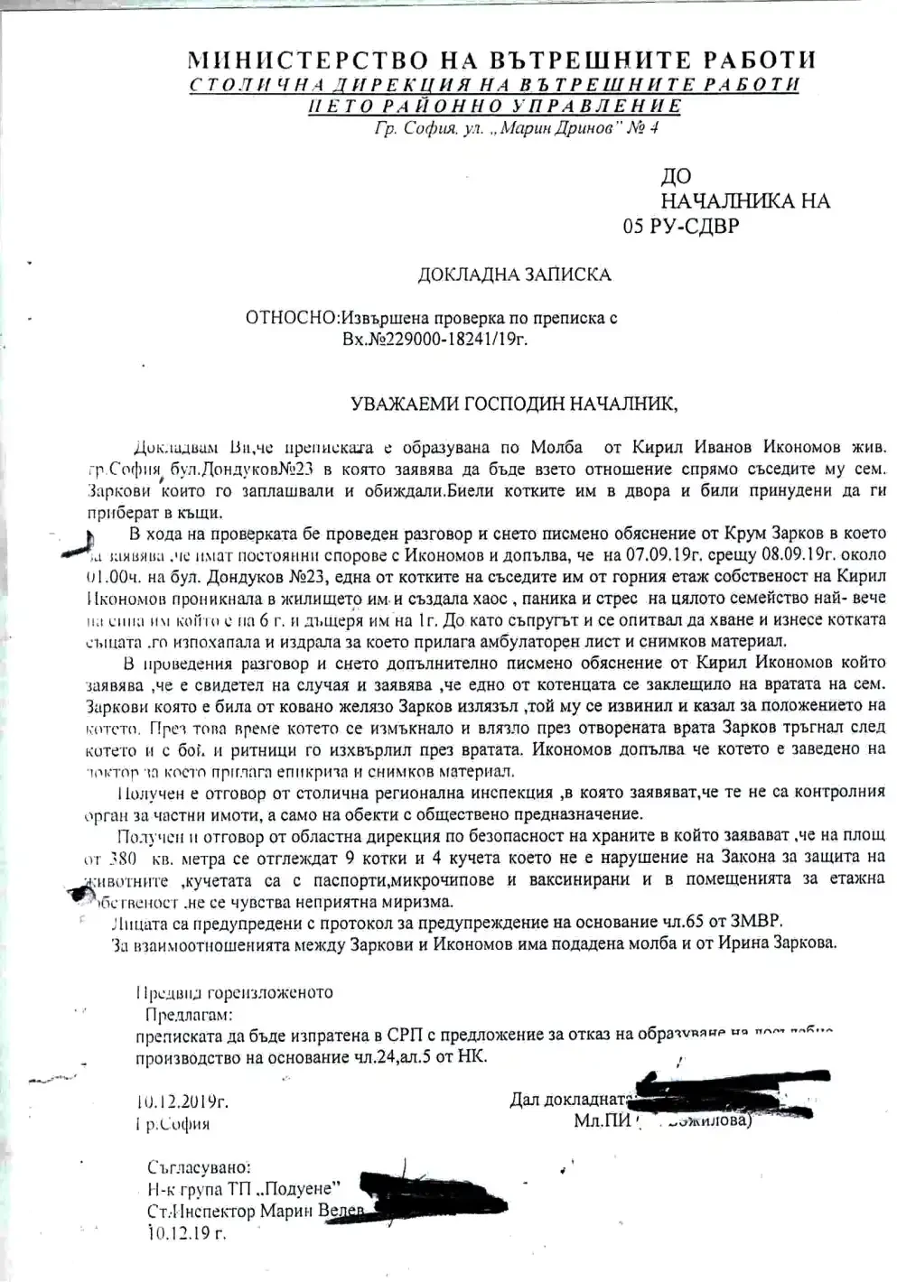 Налице са и преписките на кварталния полицай, отговарящ за района, в който живеят Крум Зарков и Мая Нешкова и Кирил Икономов. Видно от сигнала, семейството отглеждало няколко домашни любимци, сред които и котето Ади, което попаднало под ударите на настоящия служебен министър. Всички животни, които Кирил Икономов и Мая Нешкова отглеждали, са били регистрирани, ваксинирани и обезапаразитени, свидетелстват проверки на компетентните органи, инициирани по доноси на Зарков.