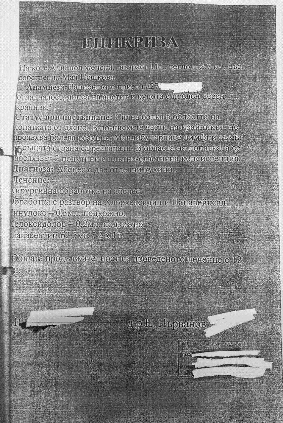 Налице е епикризата на котката Ади, съставена от д-р Н. Първанов, ветеринарен лекар от клиника в "Овча купел".