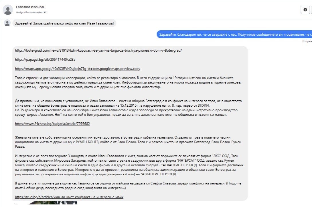 Интересно е, че през последните 3 мандата, в които Иван Гавалюгов е кмет, голяма част от поръчките се печелят от фирма “ЛКС” ООД. Тази фирма е със собственик Мирослав Захариев, който пък от своя страна е съдружник във друга фирма “ИНТЕРСАТ” ООД, заедно със Румен Бонев, който е съдружник и на сина на кмета в една фирма, а в друга на неговата съпруга - “АТЛАНТИС НЕТ” ООД. Това е и фирмата доставчик на интернет и телевизия в Ботевград. Интересно е да се проверят решенията на общинска администрация и общински съвет Ботевград за разрешения за прокарване на подземна инфраструктура (интернет кабели) на “АТЛАНТИС НЕТ” ООД, пишат още в сигнала си местни жители.