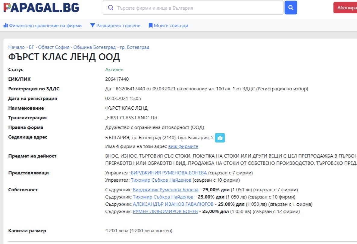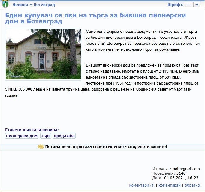 Имотът е пузнат за публична продан през 2021 г. Тогава търга участва само една фирма „Фърст клас ленд“, където един от съдружниците към днешна дата е Александър Гавалюгов.