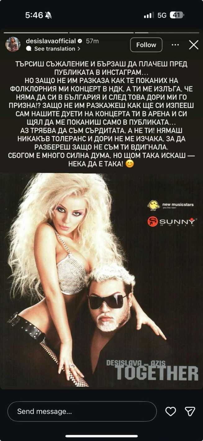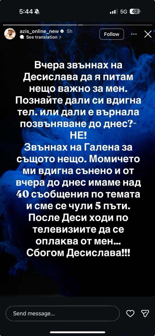 В свое стори Азис твърди, че се е свързал с Десислава по важен за него повод, но тя нито е отговорила веднага, нито е върнала обаждането по-късно. За контраст посочва реакцията на колежката им Галена, която „вдигнала сънена“ и впоследствие поддържала активна комуникация по темата. „После Деси ходи по телевизиите да се оплаква от мен… Сбогом, Десислава“, пише изпълнителят.