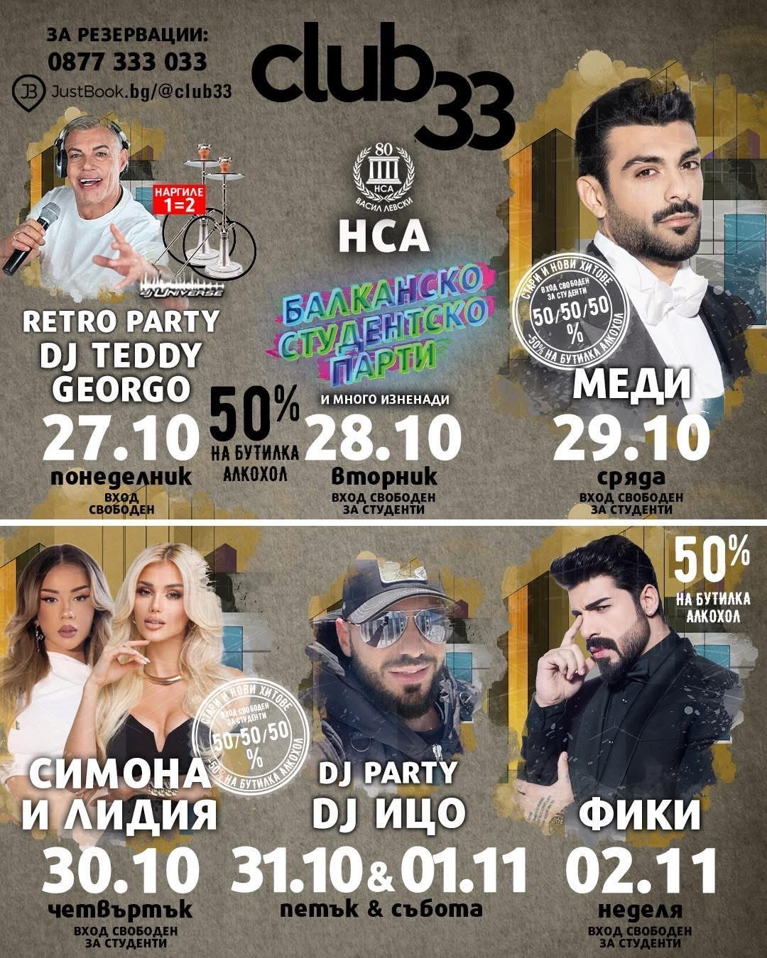 Ако и Вие искате да сте част от най-якия купон в София, резервирайте своето място на телефон 0877 333033, или през платформата http://justbook.bg/@club33.