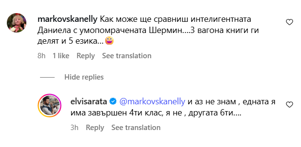 Негова последователка написа, че Даниела е класи над Шермин като поведение и образование, на което Марто се изсмя буквално: "Моля?! Глупости - един дол дренки са и двете. Едната я има завършен 4-ти клас, я не, а другата, може би, 6-ти"...
