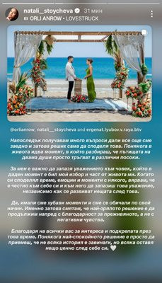 В профила си в мрежата Натали обясни, че от известно време се е питала дали с Орлин могат да продължат заедно, защото чувства помежду им все още имало... но и двамата установили, че са твърде различни. Това ги накарало да седнат, да се разберат и в крайна сметка да решат да продължат пътищата си поотделно.