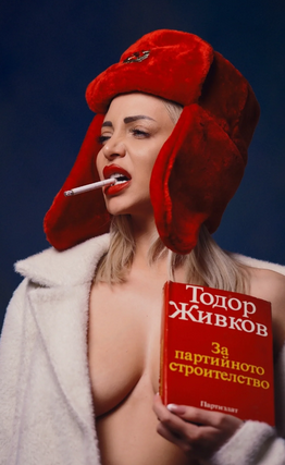 Жанета се е пуснала топлес, но не как да е, а в импровизирания образ на „пролетарка. Осипона е наденала червена ушанка, на която блести петолъчка, стиснала е в ръка книгата „Тодор Живков – за партийното строителство“, а между устните й виси цигара, запалена от запалка с образа на Владимир Илич Ленин.