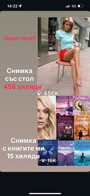 Дали е права, или не – сами ще прецените, но бившата водеща на „Преди обед“ взриви нета с нагледно доказателство за простотията българска. А именно – тя постна в стори колаж с две снимки. На едната е тя като по-млада, показала безкрайни крака... а на втората пак е тя, но заедно с книгите си, където е и акцентът.