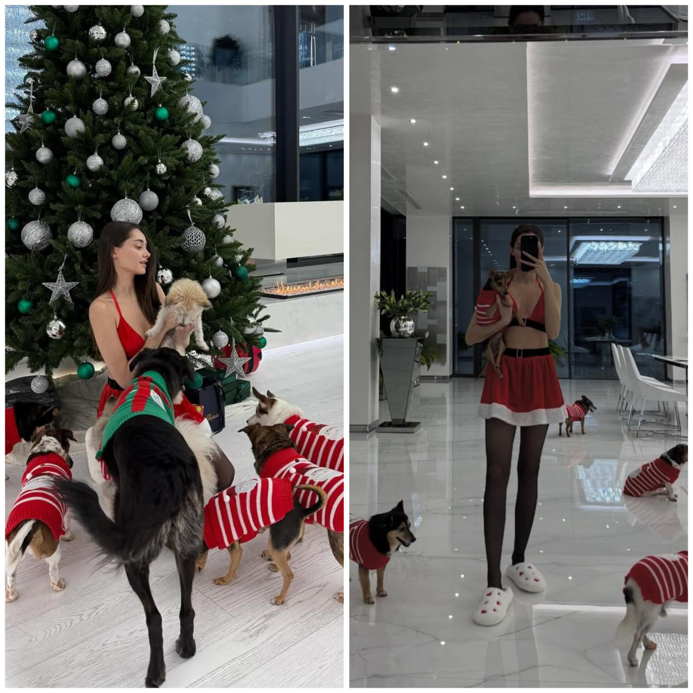 Този път той накарал Валерия да се разхожда по "цици" в имението му на празниците като тя не смеела и гък да каже. Сами виждате снимките, които пусна и на които тя е с къса червена поличка, чорапки и... червен сутиен. Колкото и да е топло в палата на милионера, не е в стила на Георгиева да се показва така. Досега тя винаги е държала на стила и хубавите дрешки, а ето я... разпищолена като момиче на повикване.