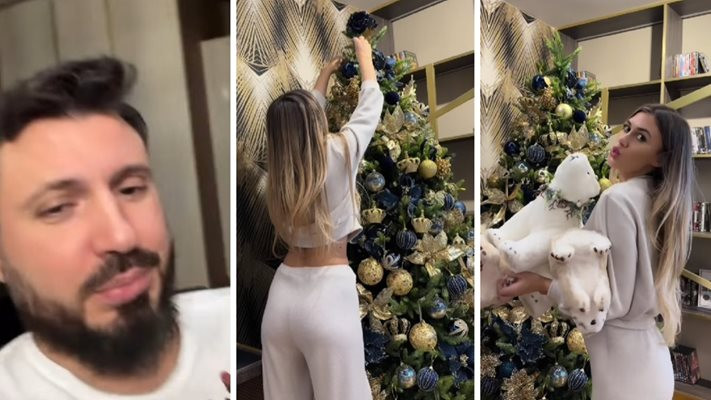 „Бях си наумила да правим една готина черна елха, но ме разубедиха. Затова пък реших тази да е в златно и в синьо – със светлинки, много играчки, цветя и всичко, както си му е редът. Отдолу имаме мечета, Дядо Коледа, много подаръци... а за върха си избрах синя роза – сещате се защо е роза, нали?!“, смигва Йоанка, а Елвиса се прави на сащисан и дори леко й се мръщи. Сладури...
