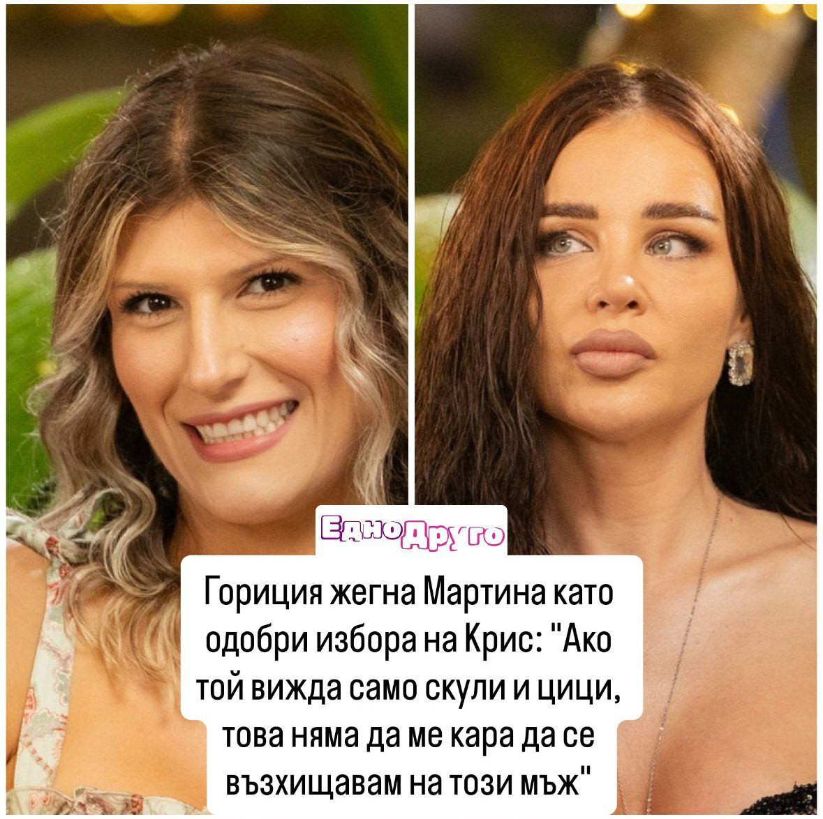 Това беше изречено пред Мартина Петрова, която моментално се усети и реагира вбесена. Бившата ергенка натърти на Горица, че самата тя също има силикон и не вижда с какво право може да коментира толкова злобно други хора.