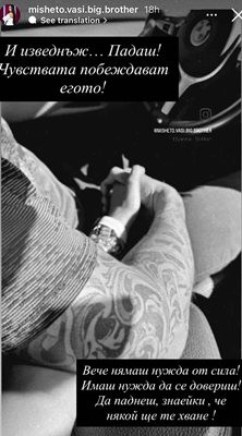 Мишето публикува кадри с любимия си в стори, но засега предпочете да запази лицето му скрито. Фотосът беше от типа класики в жанра, на които се вижда само двете им ръце, които са преплели пръсти - втръснаха вече тези кадри, но... всеки втори ги ползва.