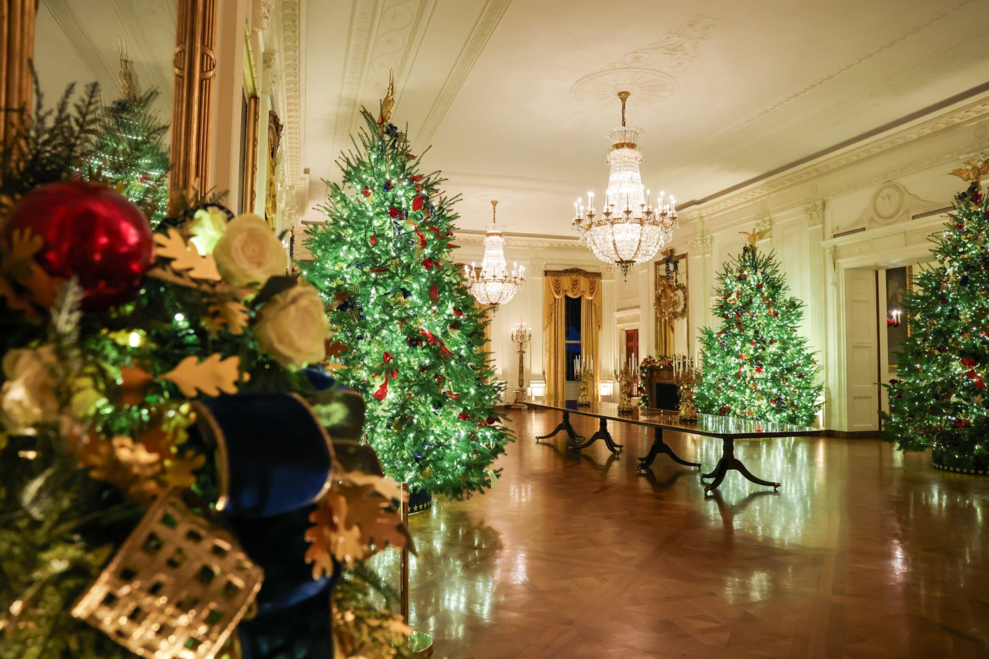 Източната зала е декорирана в патриотичните цветове червено, бяло и синьо, с национални символи, включително орли, поставени като върхове на дърветата - препратка към предстоящото национално честване America250. Белоглавият орел е избран за символ на новосъздадената държава през 1782 г. Дърветата са украсени и със звезди, рози и дъбови листа.